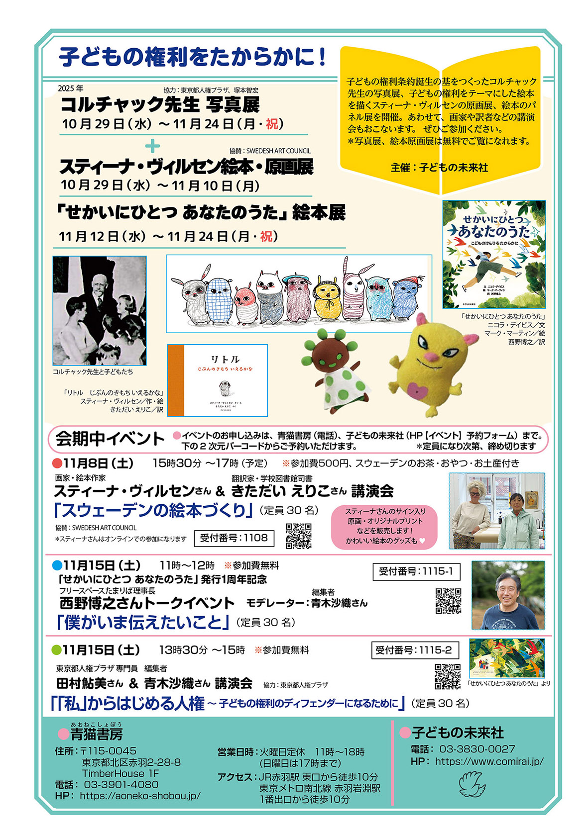 青猫書房(東京・北区)にて、子どもの権利条約誕生の基をつくったコルチャック先生の写真展、子どもの権利をテーマにした絵本を描くスティーナ・ヴィルセンの原画展、絵本のパ